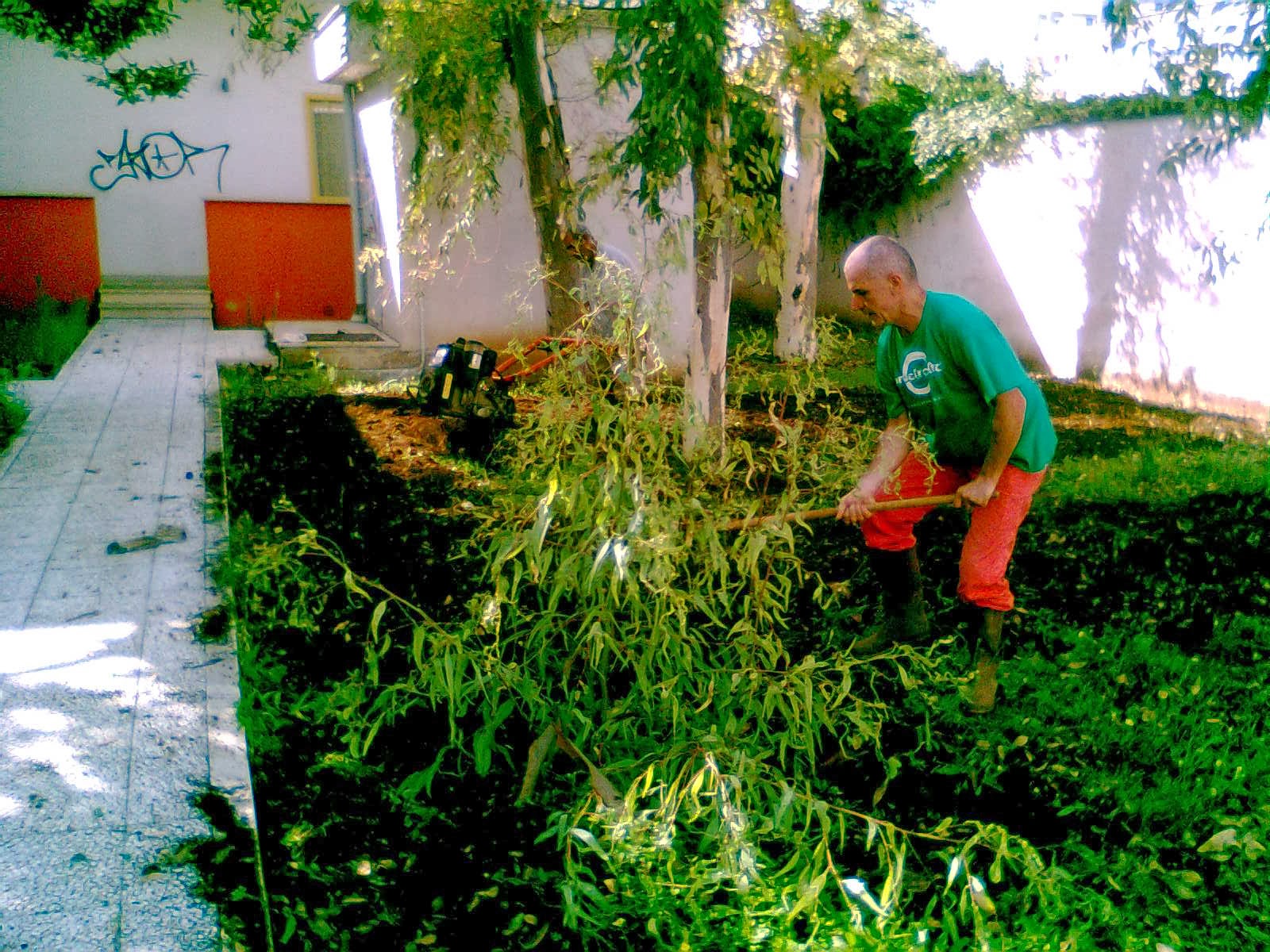 Abbiamo interrato alcune piante altrimenti buttate, resto del trasloco dell'asilo comunale, abbiamo dato acqua a quelle che ci sono e abbiamo "pacciamato" (ricoperto di paglia) la base delle piante per aiutarle a sopportare l'afa della nostra lunga estate.